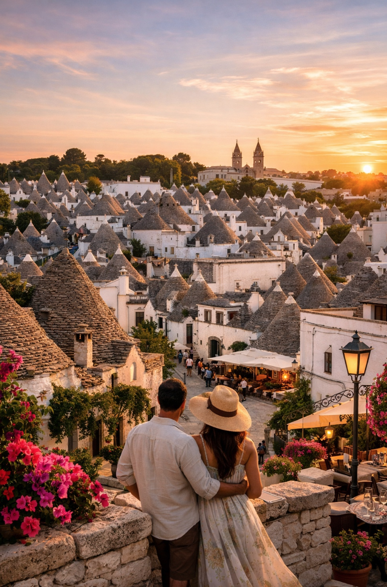 De regreso a Apulia, el Valle d’Itria despliega postales icónicas: los trulli de Alberobello, únicos en el mundo, y Ostuni, la Ciudad Blanca, suspendida sobre un mar de olivares centenarios. Lecce recibe al viajero con la elegancia exuberante de su barroco, una ciudad luminosa y artística que invita a perderse entre plazas, fachadas esculpidas y talleres artesanos.