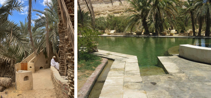 En el interior de un exuberante palmeral se encuentra el pequeño hotel ecológico en el que nos alojaremos. Cuenta con jardín orgánico propio y piscina de agua de manantial, no le falta detalle. Siguiendo el camino que lleva al Templo de Amón llegaremos al Baño de Cleopatra, también conocido por el manantial de Juba, el agua se recoge en una piscina de roca, lugar muy popular donde viene a bañarse la población local, cerca de las plantaciones de palmeras.